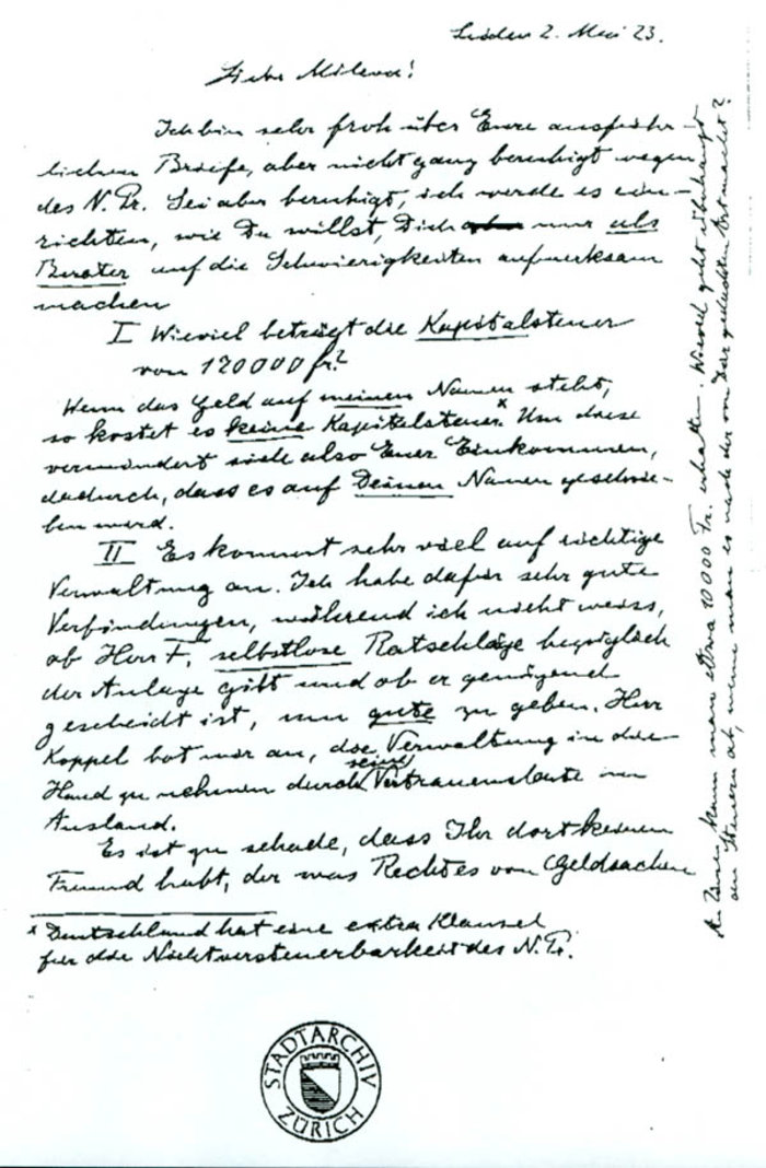 “Μην μελετάς υπερβολικά πολύ όταν θα έρθουν τα βιβλία σου. Αντίθετα, καλύτερα να ξεκουραστείς, ώστε να μπορείς να γίνεις ξανά το παλιό μου αλητάκι. Ένα πράγμα σου ζητάω μόνο · να προσέχεις τον εαυτό σου. Αν δεν το κάνεις, θα φας ξύλο. Ο Έχρατ δεν έχει πάρει ακόμη τη θέση στο Φράουενφελντ. Την διεκδικούν από κοινού με τον Μάτερ. Όπως και να έχει, ένας τους θα την πάρει. Σε κάθε περίπτωση, εμένα με στηρίζουν οικονομικά οι δικοί μου. Θα μπορούσα να δεχτώ μία δουλειά σε ασφαλιστική για τρεις εβδομάδες για οχτώ φράγκα την ημέρα, αλλά την απέρριψα, γιατί σκέφτηκα ότι θα εκμεταλλευτώ καλύτερα τις διακοπές μου μελετώντας θεωρίες σημαντικές για τις σπουδές μου και μαθαίνοντας τη δουλειά του πατέρα μου στην Ιταλία. “